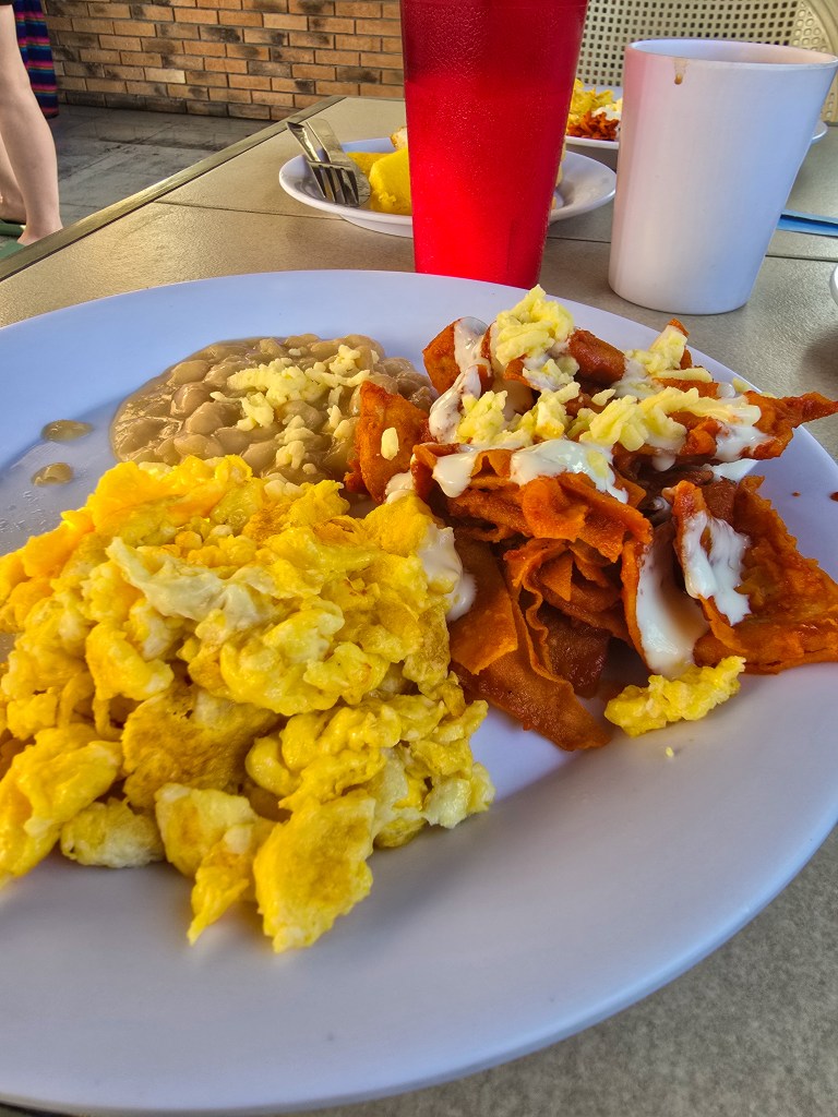 Na ďalší deň sme išli na raňajky. Nečakajte žiadne švédske stoly. Za barom stál pán, spýtal sa, čo si dáme – a asi sme si mohli vybrať len jedno jedlo. Moja španielčina je niekde na úrovni kojenca, ale objednal som „chilaquiles“, načosky v červenej omáčke, fazuľky a vajíčka. Načosky boli mäkké, mne osobne až tak nechutili – mám ich rád chrumkavé. Ale v tom teple mi aj tak veľmi nechutí jesť.